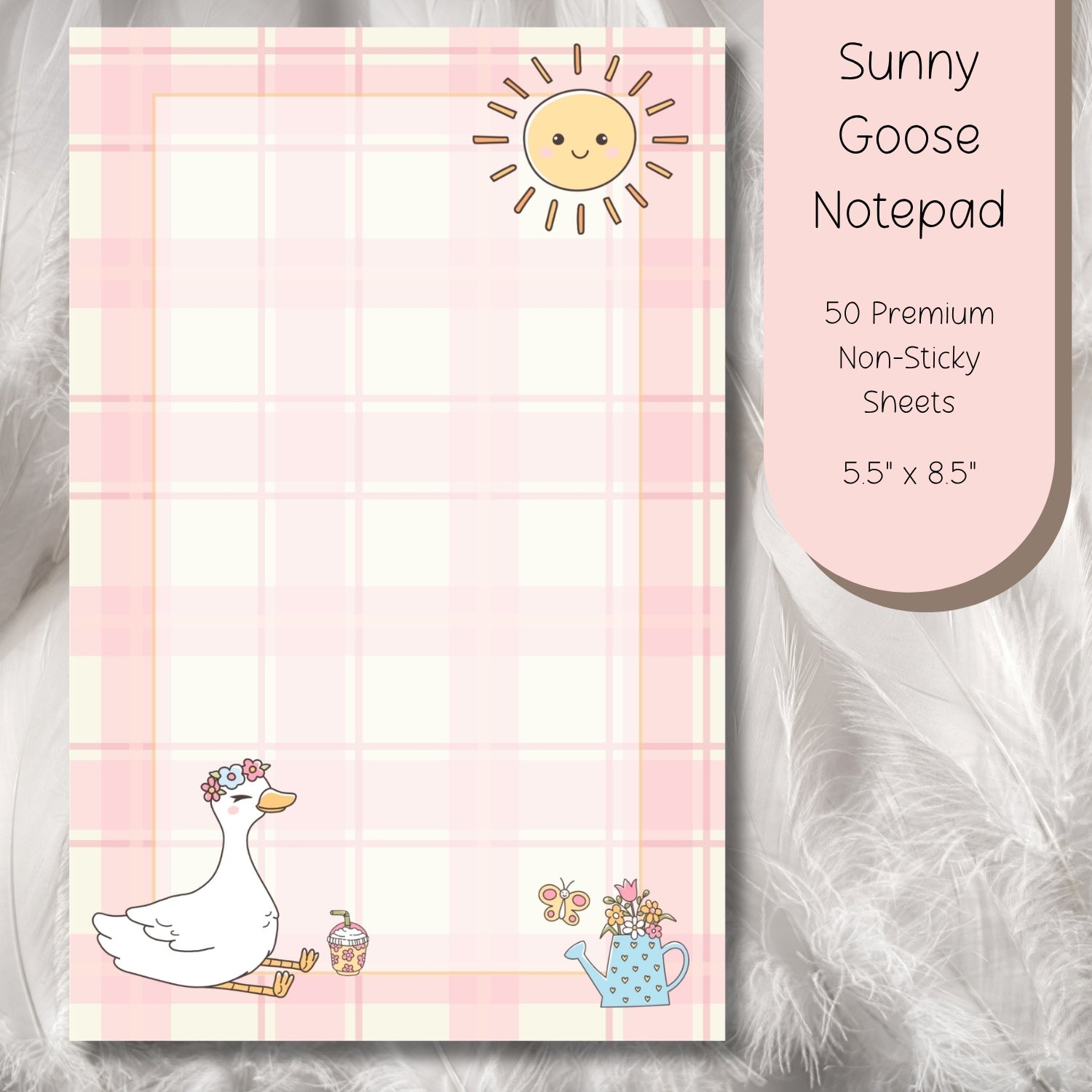 Our Sunny Goose Notepad from the Spring Goose Collection brings soft, happy energy to your desk. With a warm pastel plaid background, a sweet sun overhead, and your flower-crowned goose enjoying a peaceful moment, this design feels like a quiet spring morning in paper form.